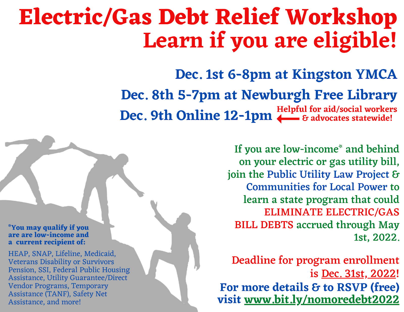 Join the Public Utility Law Project & Communities for Local Power for one of our workshops to learn more about your utility’s low-income bill discount program and New York State’s Electric and Gas Debt Relief Program!!